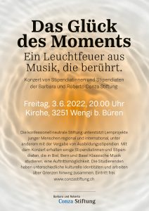 Die Barbara und Roberto Conza Stiftung ist konfessionell neutral. Sie unterstützt u. a. Lernprojekte junger Menschen durch Vergabe von Ausbildungsstipendien. Mit diesem Konzert erhalten einige Stipendiatinnen und Stipendiaten, die Musik studieren, in schwieriger Zeit eine Auftrittsmöglichkeit. Die Studierenden setzen ein Zeichen für die friedliche Zusammenarbeit und Verständigung über kulturelle Identitäten hinweg. Eintritt frei.